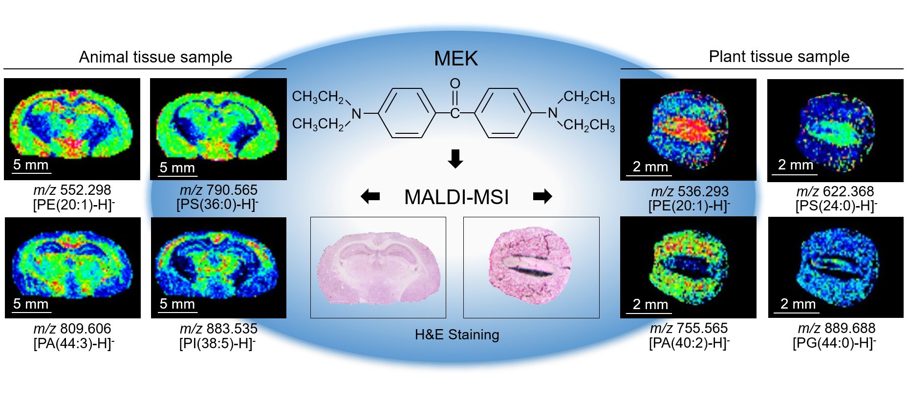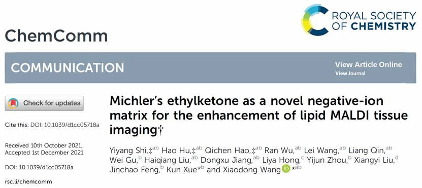 王晓东教授团队通过系统研究发现四乙氨基米氏酮(Michler's ethylketone,MEK)作为一种新型负离子基质可显著增强(-)MALDI-MSI对生物组织样本中脂质分子的原位检测及成像表征性能。研究表明:该基质具有强紫外激光吸收能力、微米级结晶尺寸且形态均一性好,高真空化学稳定性、低基质离子干扰、温和离子化效能及强脂质离子化效率等优势,同时适用于动植物组织样本表面多种内源性脂质分子(PE、PA、PG、PS及PI等)负离子模式检测及成像表征。研究发现,该基质不仅适用于小鼠脑、肝组织表面多种内源性脂质分子的原位表征,且对于中国特色药用植物南方红豆杉种子也具有较好的适用性。该新型MALDI基质的筛选发现为进一步拓展(-)MALDI-MSI在动、植物脂质组学研究领域中的应用提供了一定的技术支持。